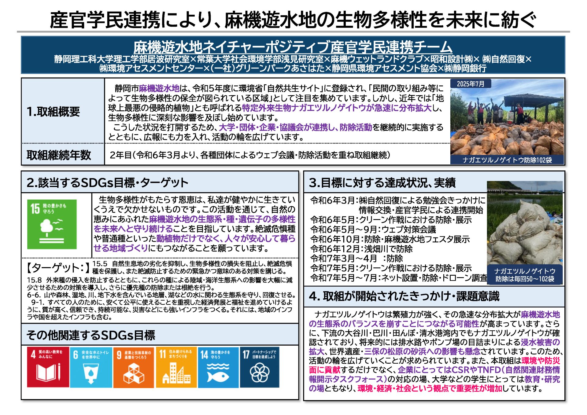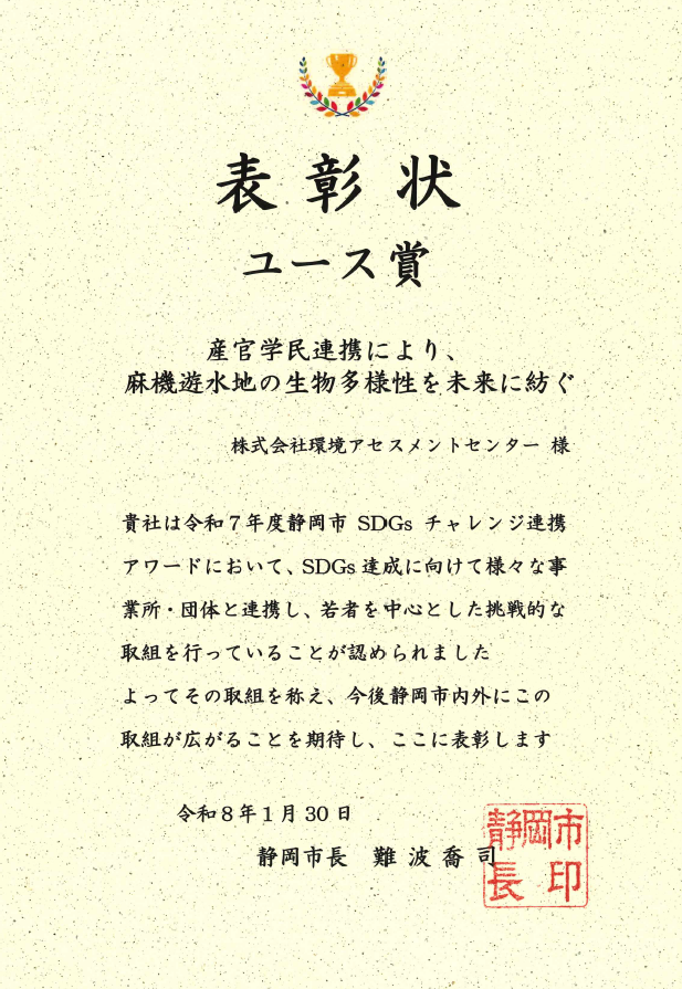 2026年1月30日、「2025静岡市グッド・パートナーズ表彰式」に参加しました。表彰式では、弊社が参画する「麻機遊水地ネイチャーポジティブ産官学民連携チーム」の取組が評価され、令和7年度静岡市SDGsチャレンジ連携アワードにおいて「ユース賞」を受賞しました。弊社は、本取組で事前調査や防除活動に加え、動画制作やポスター展示、学会発表など、多様な手法による情報発信にも積極的に取り組んできました。